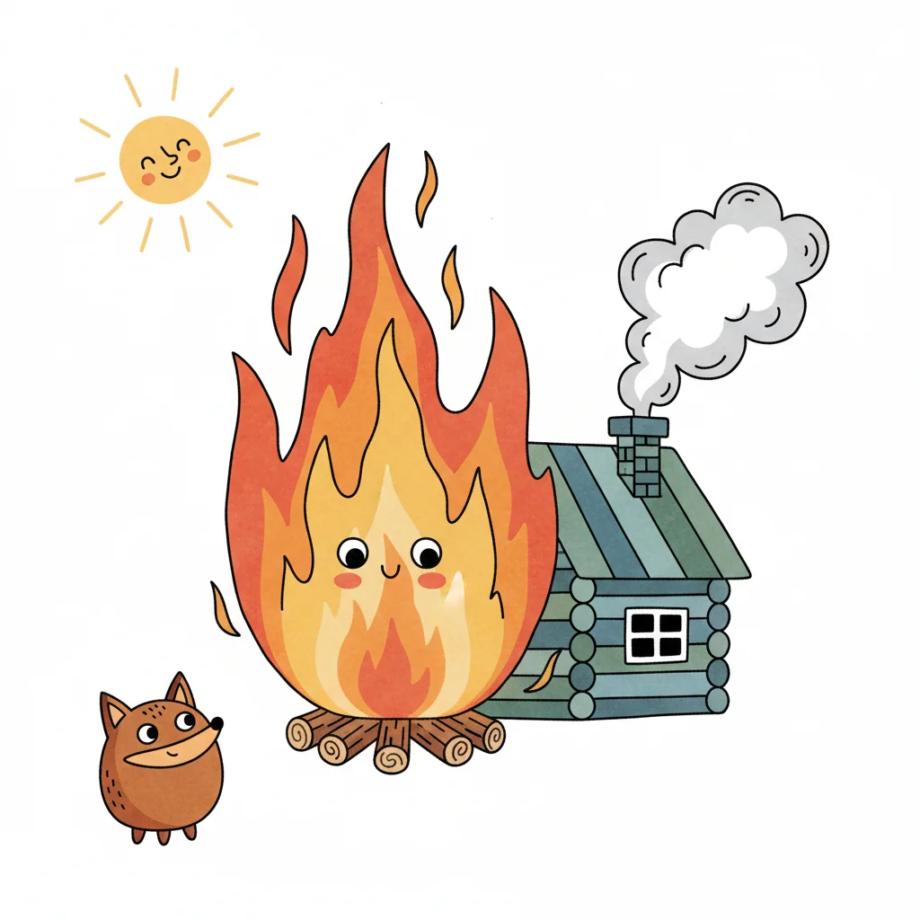 Niedliche Illustration von Lagerfeuer mit Gesicht, Fuchs, Hütte und lächelnder Sonne.