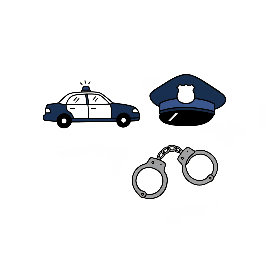Illustration von Polizeiauto, Mütze und Handschellen, Symbole der Strafverfolgung.