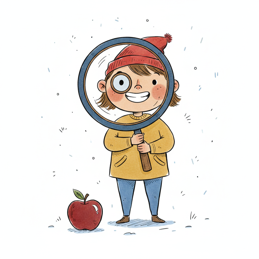 Ein lächelndes Kind mit roter Mütze hält eine Lupe vor sein Gesicht, ein Auge ist vergrößert. Ein Apfel liegt daneben.