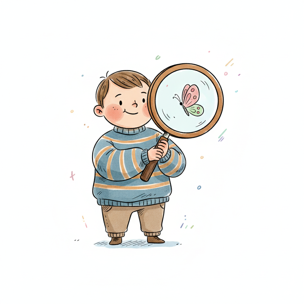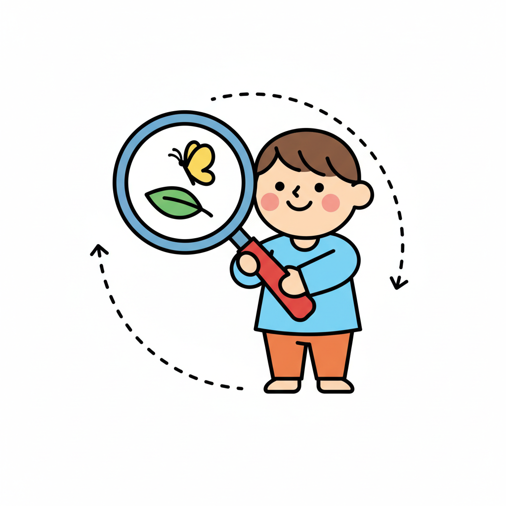 Ein lächelnder Junge beobachtet einen Schmetterling mit einer Lupe. Ein zweiter Schmetterling fliegt vorbei.