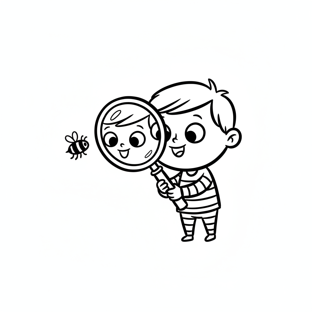 Ein fröhlicher Cartoon-Junge betrachtet eine Biene mit einer Lupe. Die Biene ist vergrößert zu sehen.
