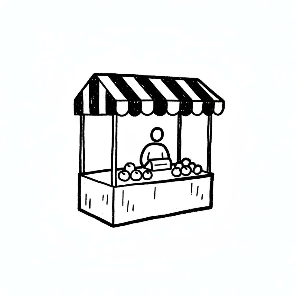 Schwarz-weiße Skizze eines Marktstandes mit gestreiftem Dach, Verkäufer und Auslage von Früchten.