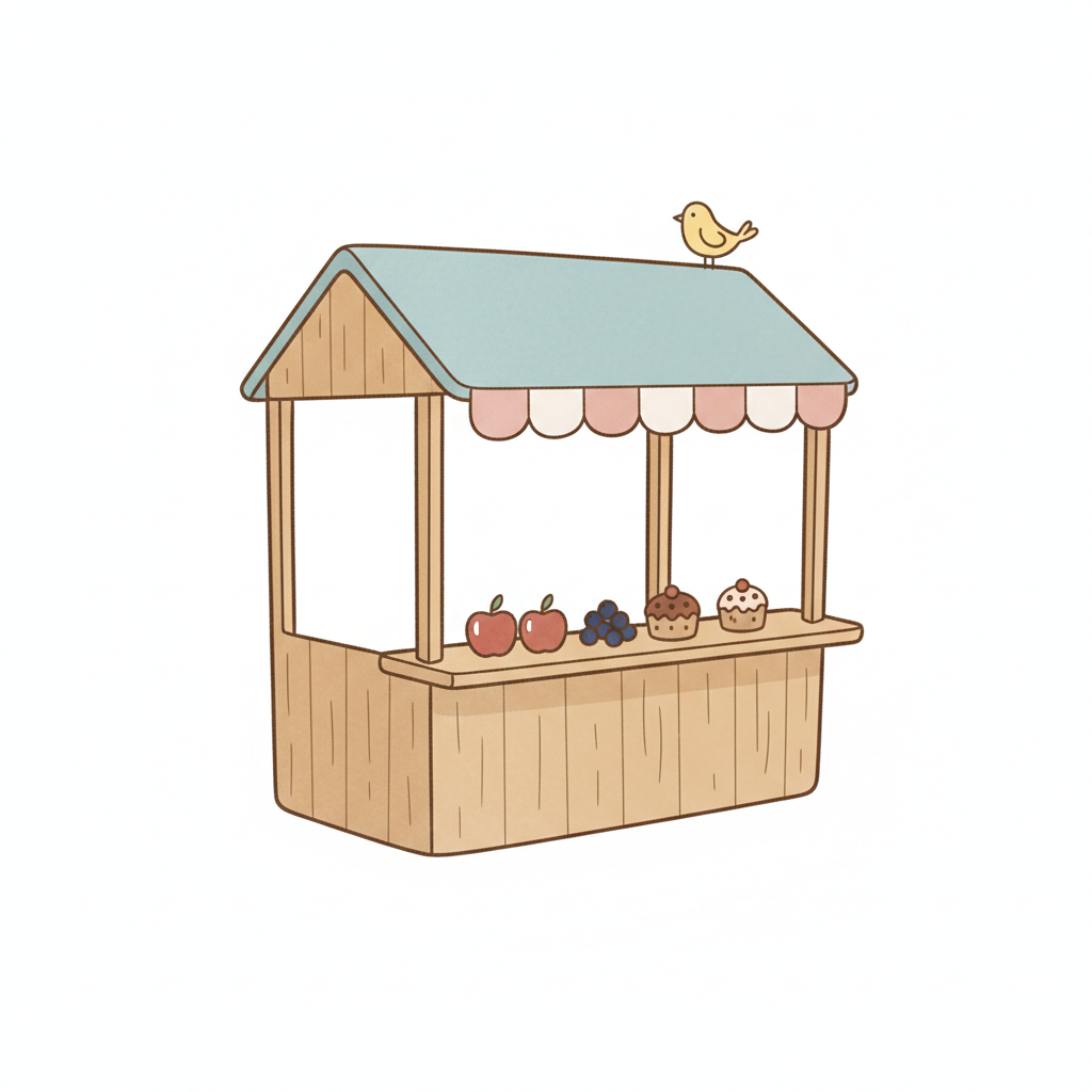 Niedlicher Marktstand mit Äpfeln, Beeren, Cupcakes und einem Vogel auf dem Dach.