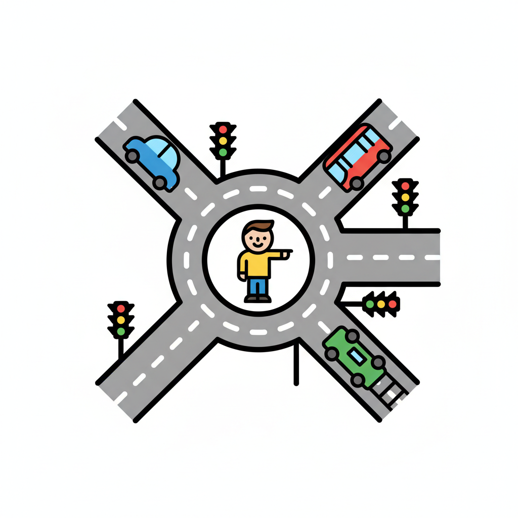 Cartoon-Darstellung eines Kreisverkehrs mit Autos, Ampeln und einer zeigenden Person.