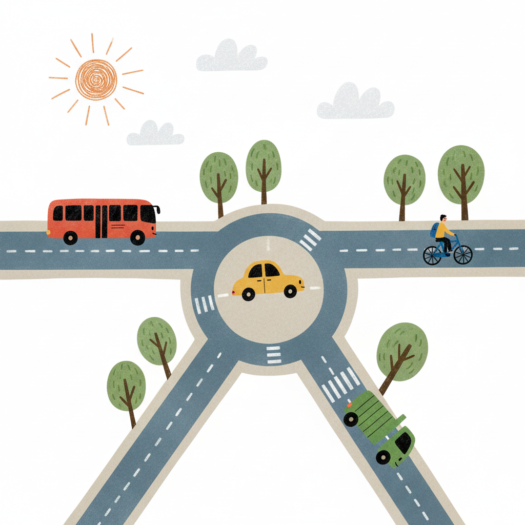 Bunte Illustration eines Kreisverkehrs mit verschiedenen Fahrzeugen und Bäumen an einem sonnigen Tag.