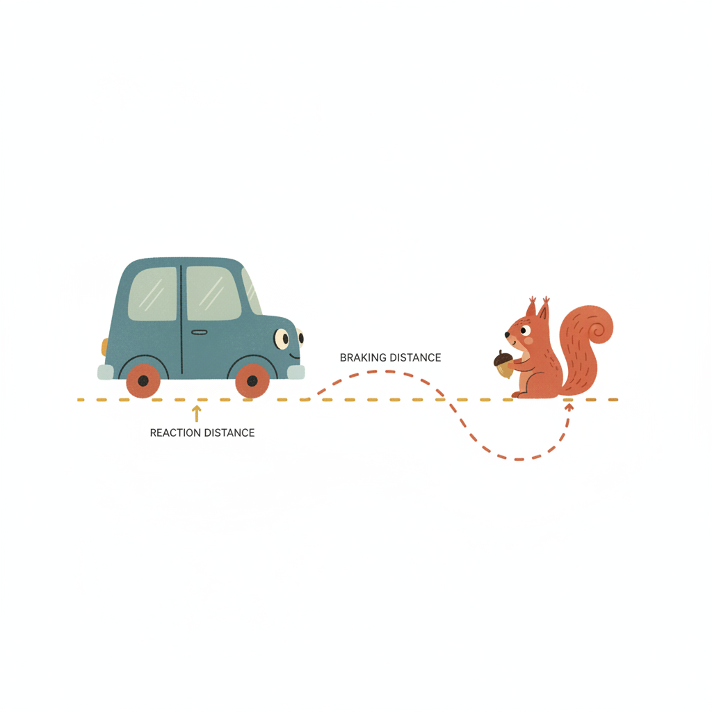 Cartoon-Auto und Eichhörnchen illustrieren Reaktions- und Bremsweg im Straßenverkehr.