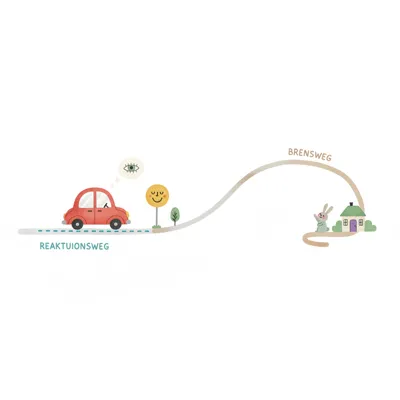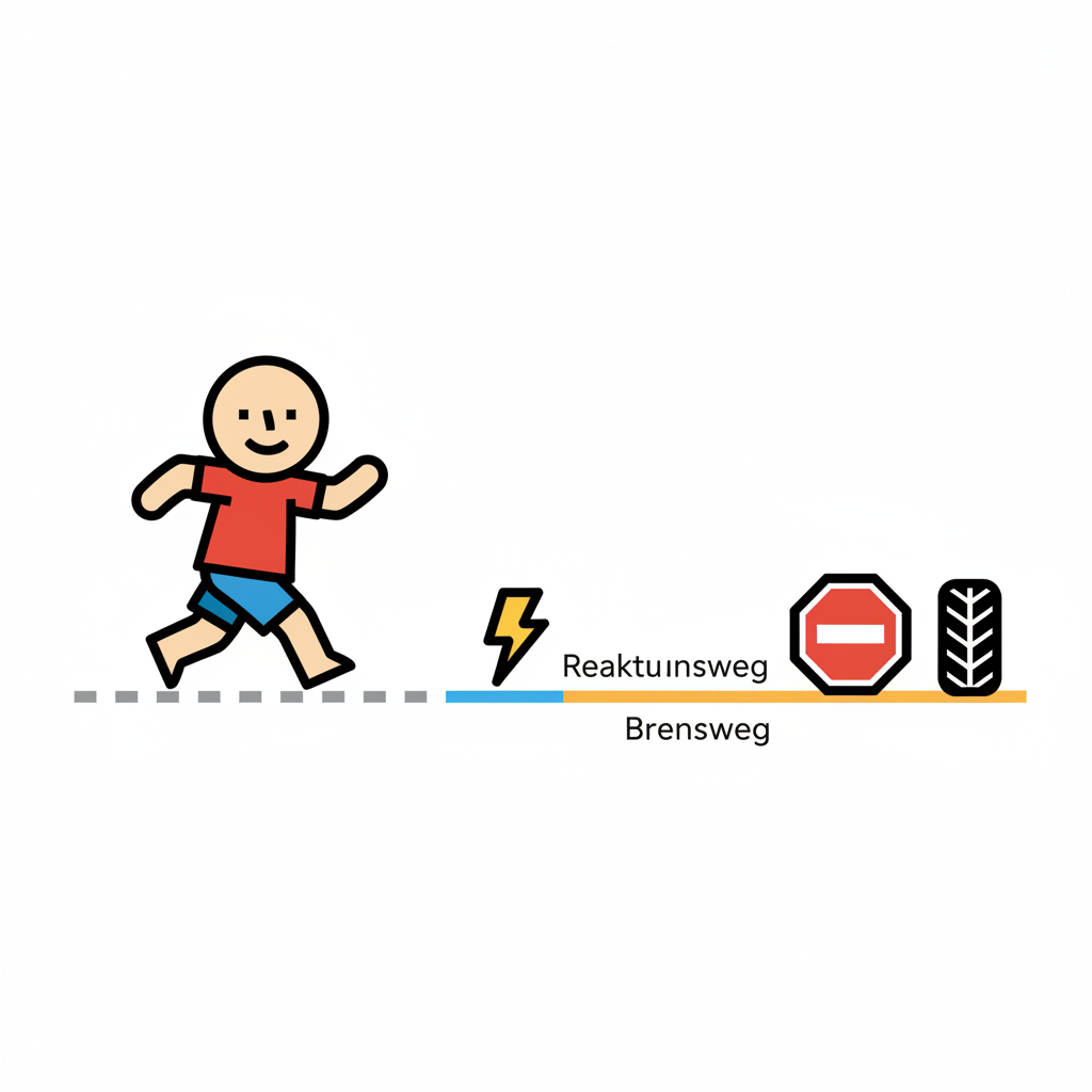 Cartoonfigur läuft, daneben Diagramm zu Reaktions- und Bremsweg mit Symbolen.