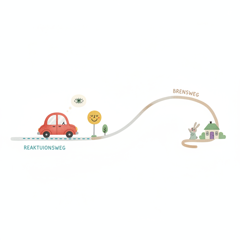 Illustration von Reaktions- und Bremsweg: Auto sieht Hase, reagiert und bremst vor Haus.