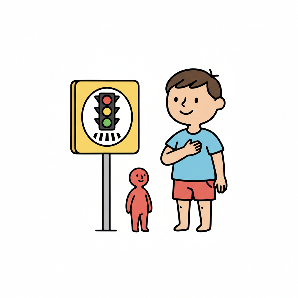 Ein Junge steht lächelnd neben einem Ampelschild, das Grün anzeigt. Eine kleine Figur ist dabei.