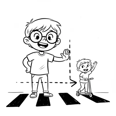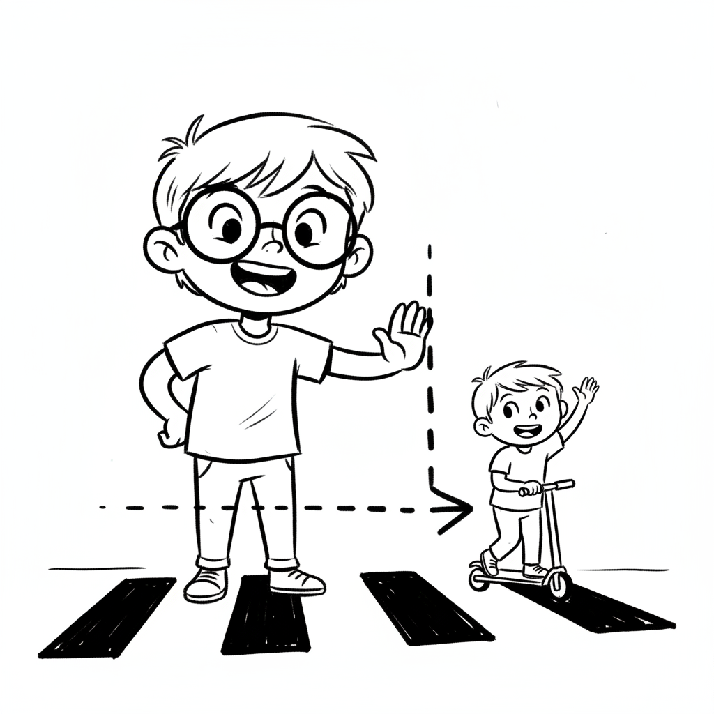 Junge zeigt kleinem Kind auf Roller den sicheren Weg über den Zebrastreifen.