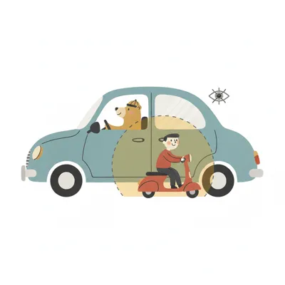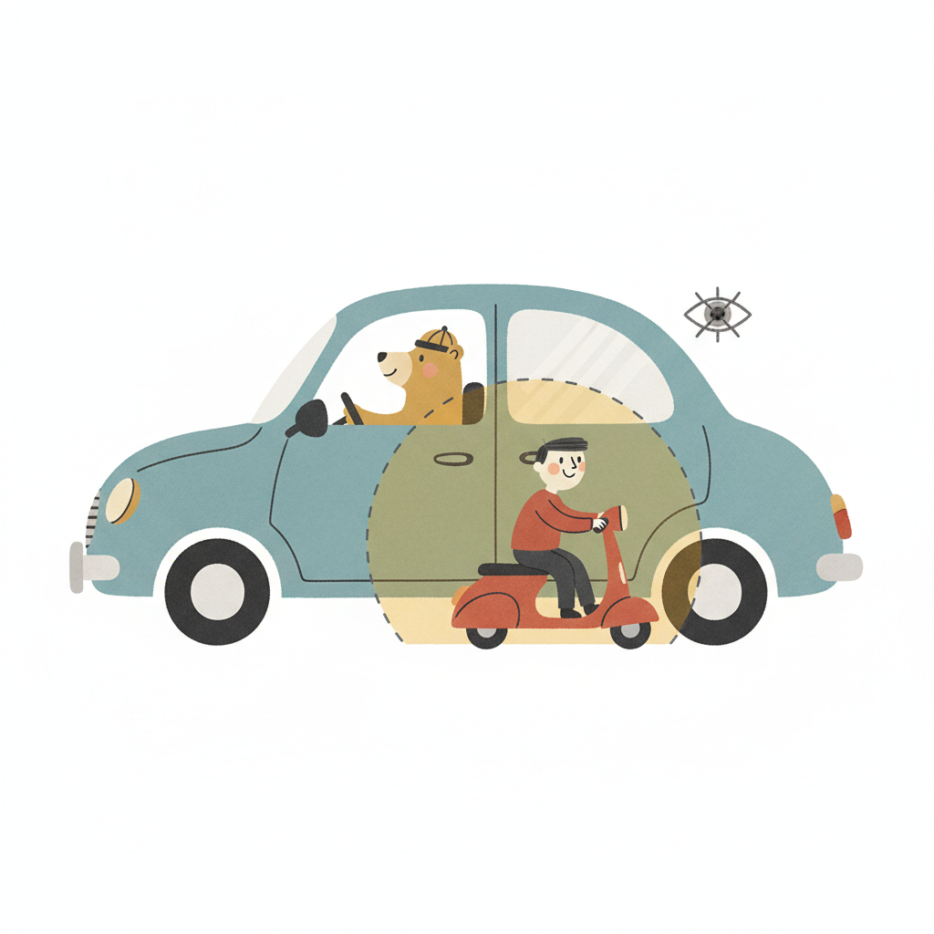 Bär fährt Auto, Kind auf Roller im toten Winkel. Illustration zur Verkehrssicherheit.