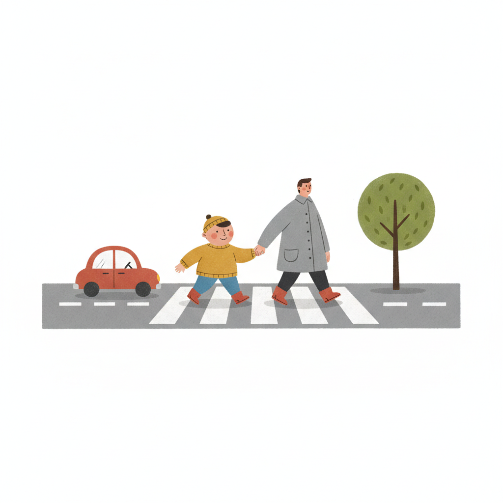 Vater und Kind überqueren Hand in Hand einen Zebrastreifen, umgeben von Verkehrssymbolen.