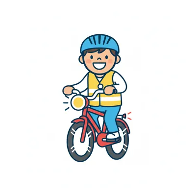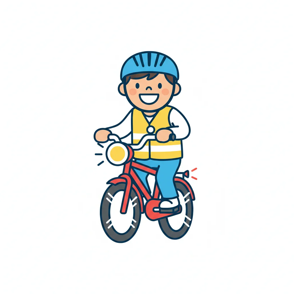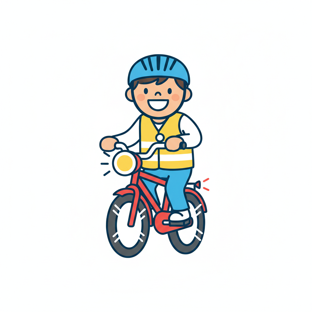 Fröhliches Kind fährt sicher Fahrrad: Helm, Warnweste, Licht.