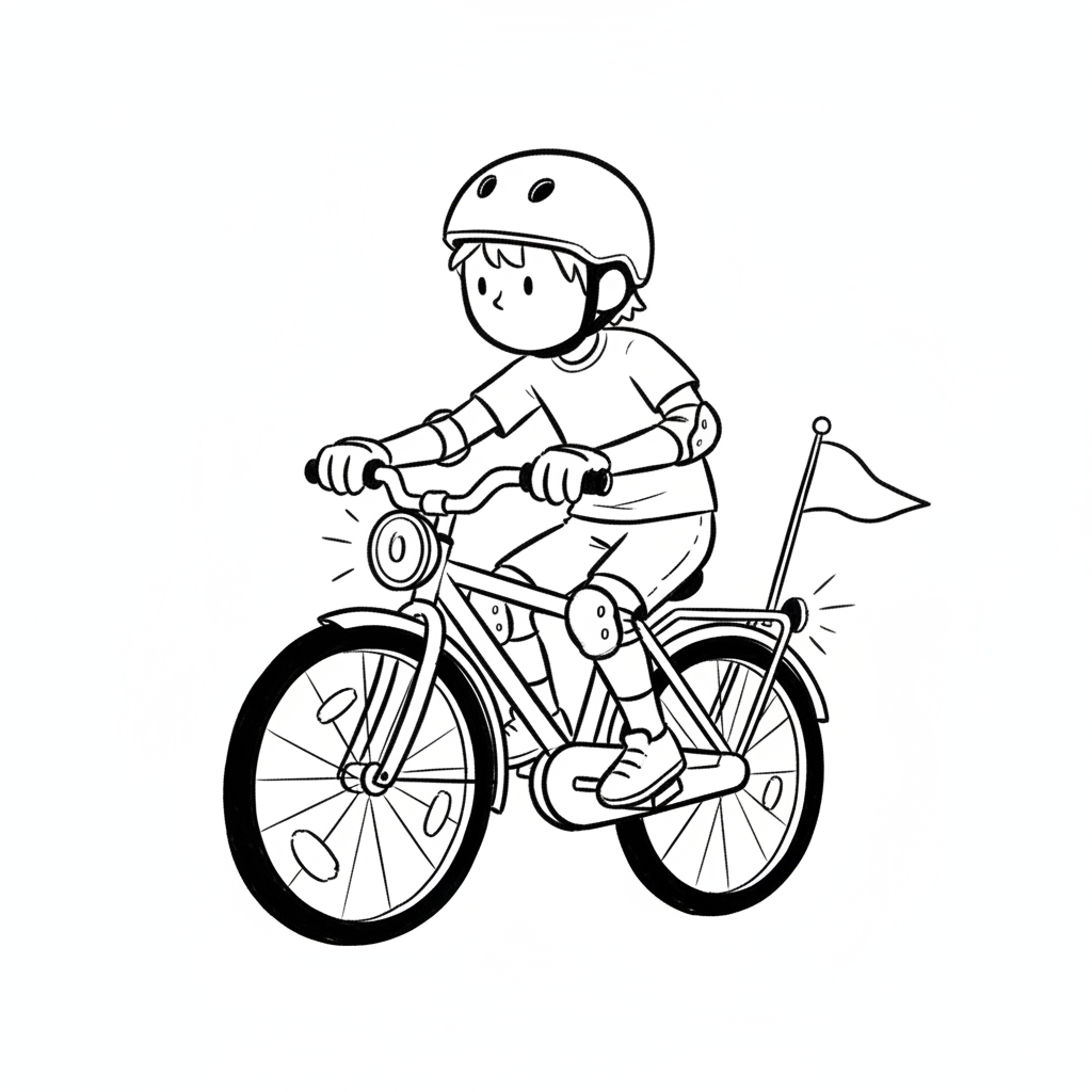 Schwarz-weiß-Zeichnung eines Kindes mit Helm und Schutzkleidung auf einem Fahrrad.