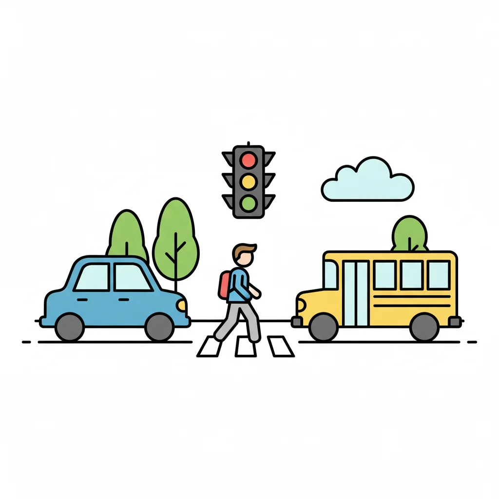 Cartoon-Szene: Person überquert Zebrastreifen, Ampel rot, Auto und Schulbus warten.