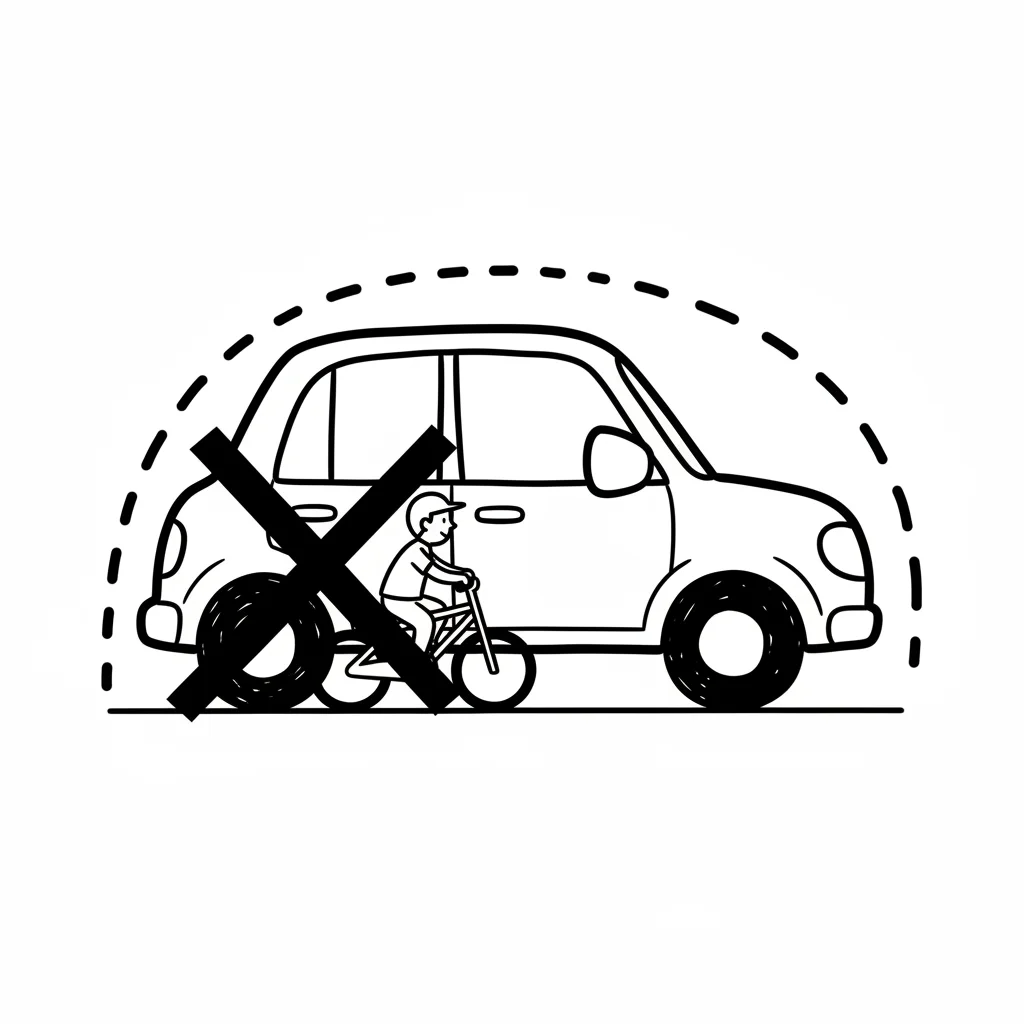 Warnung: Kind auf Fahrrad zu nah am Auto im Gefahrenbereich, durchgestrichen.