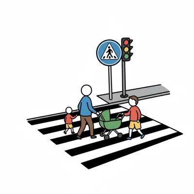 Illustration: Familie überquert Zebrastreifen mit Kinderwagen bei roter Ampel.