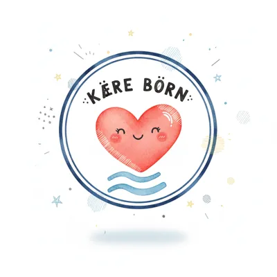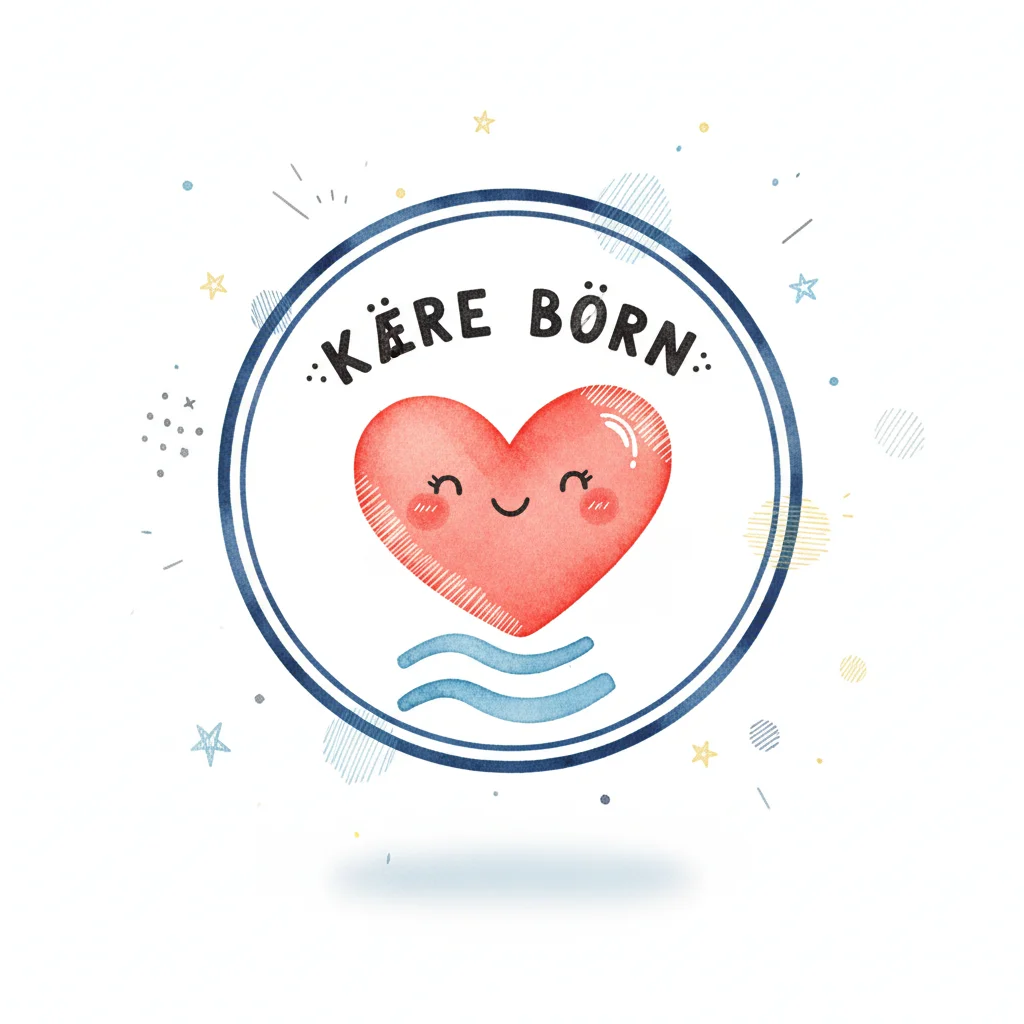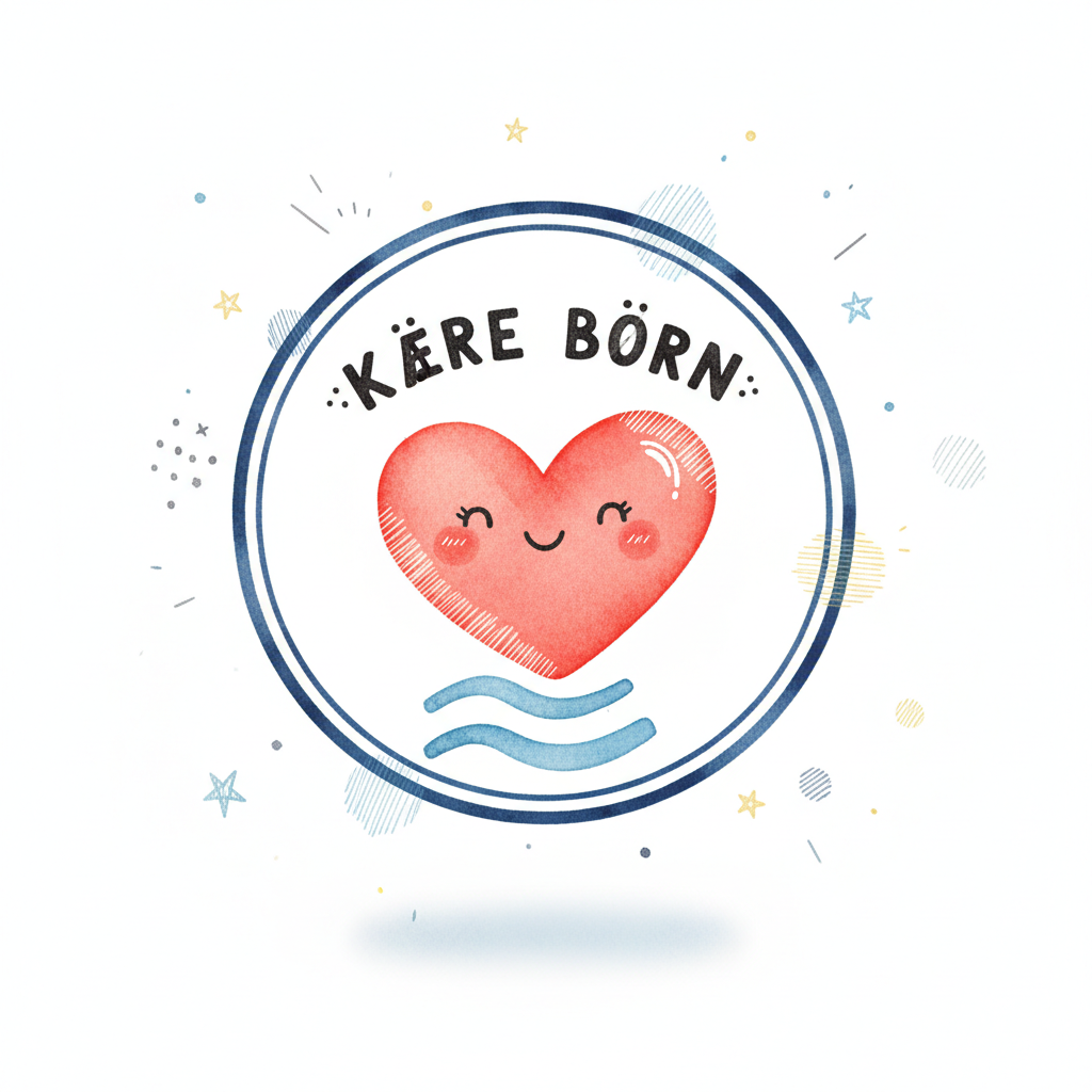 Niedliches Aquarell-Herz mit lächelndem Gesicht und Text 'KÄRE BÖRN' in blauem Kreis.
