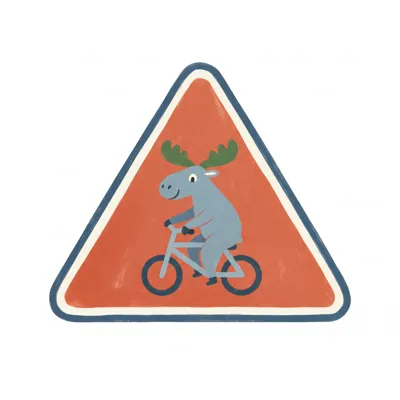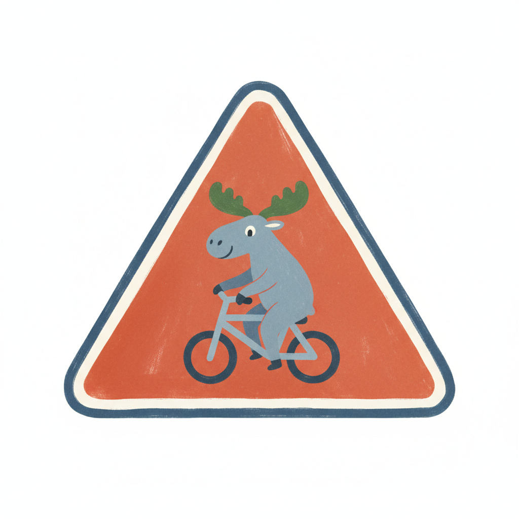 Niedlicher Cartoon-Elch fährt Fahrrad auf einem roten dreieckigen Schild.