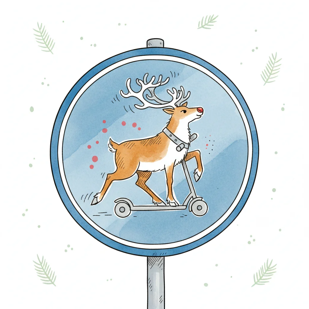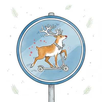 Ein Rentier fährt auf einem Roller in einem runden blauen Schild, festliche Illustration.