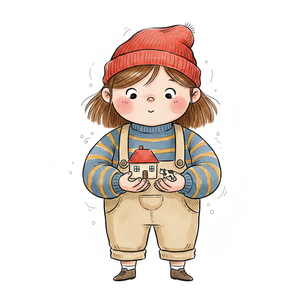 Niedliches Cartoon-Mädchen mit Mütze hält ein kleines Haus und eine Kuh in den Händen.