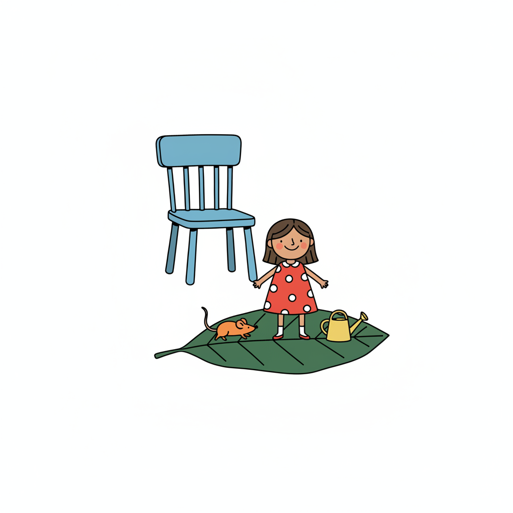 Ein Mädchen, eine Maus und eine Gießkanne auf einem Blatt, mit einem blauen Stuhl. Kindliche Illustration.
