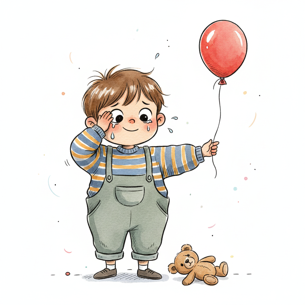 Ein Junge mit einem roten Ballon und einem Teddy, leicht traurig aber fröhlich.