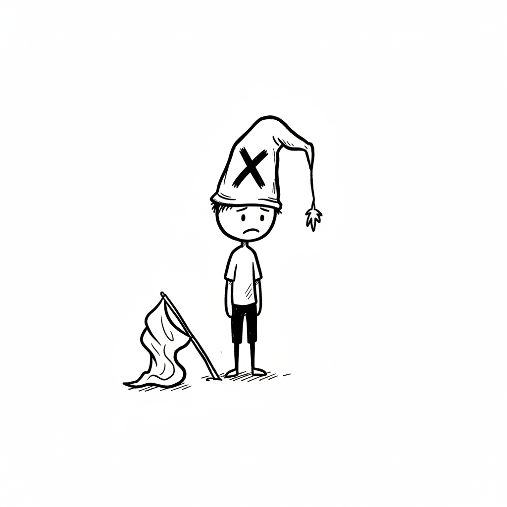 Traurige Strichfigur mit Eselskappe und weißer Flagge am Boden, symbolisiert Niederlage.