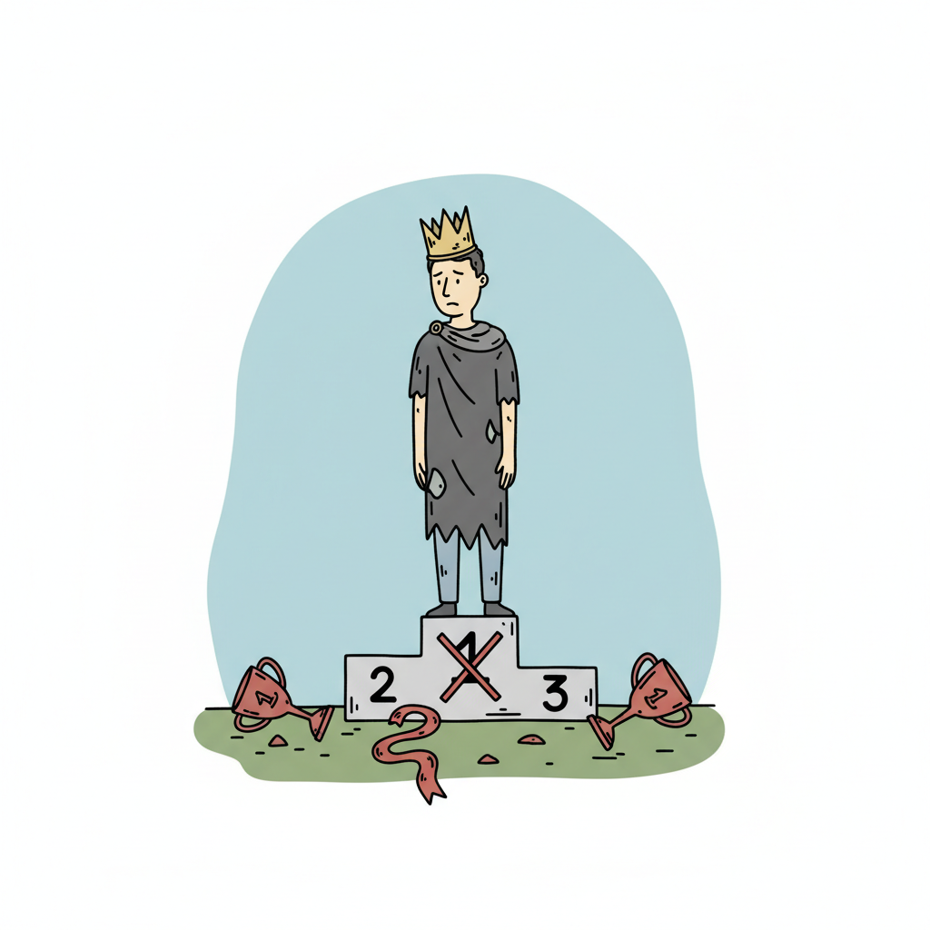 Trauriger König in Lumpen auf Podest mit durchgestrichener 1, umgestürzte Trophäen am Boden.