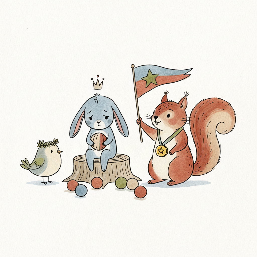 Hase traurig auf Podest, Eichhörnchen feiert Sieg mit Fahne und Medaille, Vogel schaut zu.