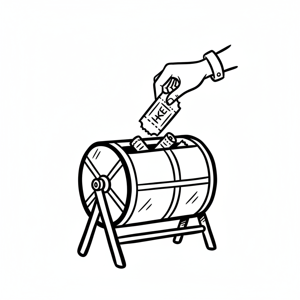 Hand wirft Los in eine Lostrommel. Schwarz-weiß-Zeichnung.