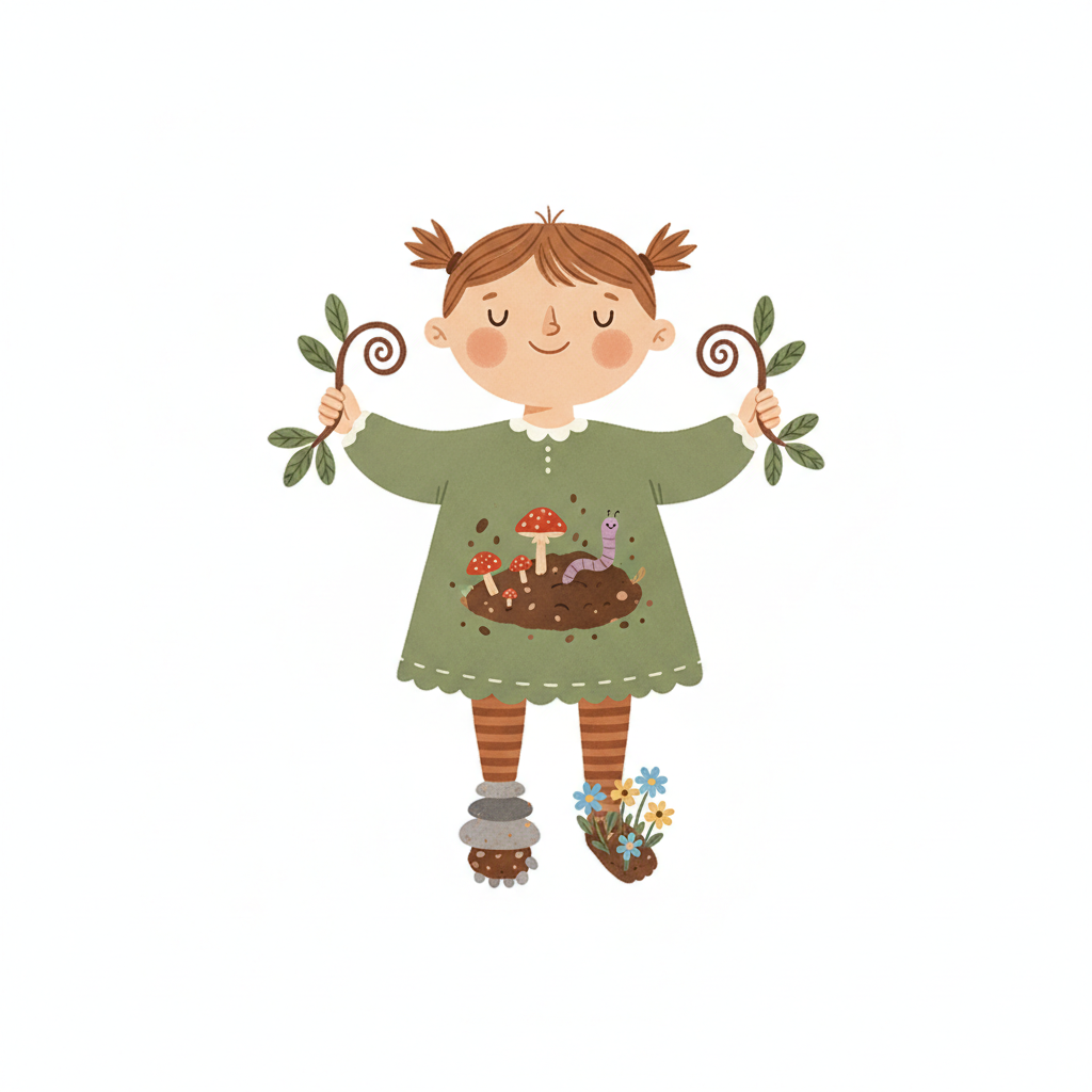 Ein schlammiges Cartoon-Kind mit einem Pflanzenkeim auf dem Kopf und einer Blume am Bein.