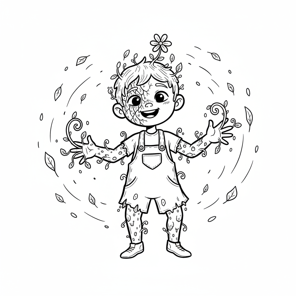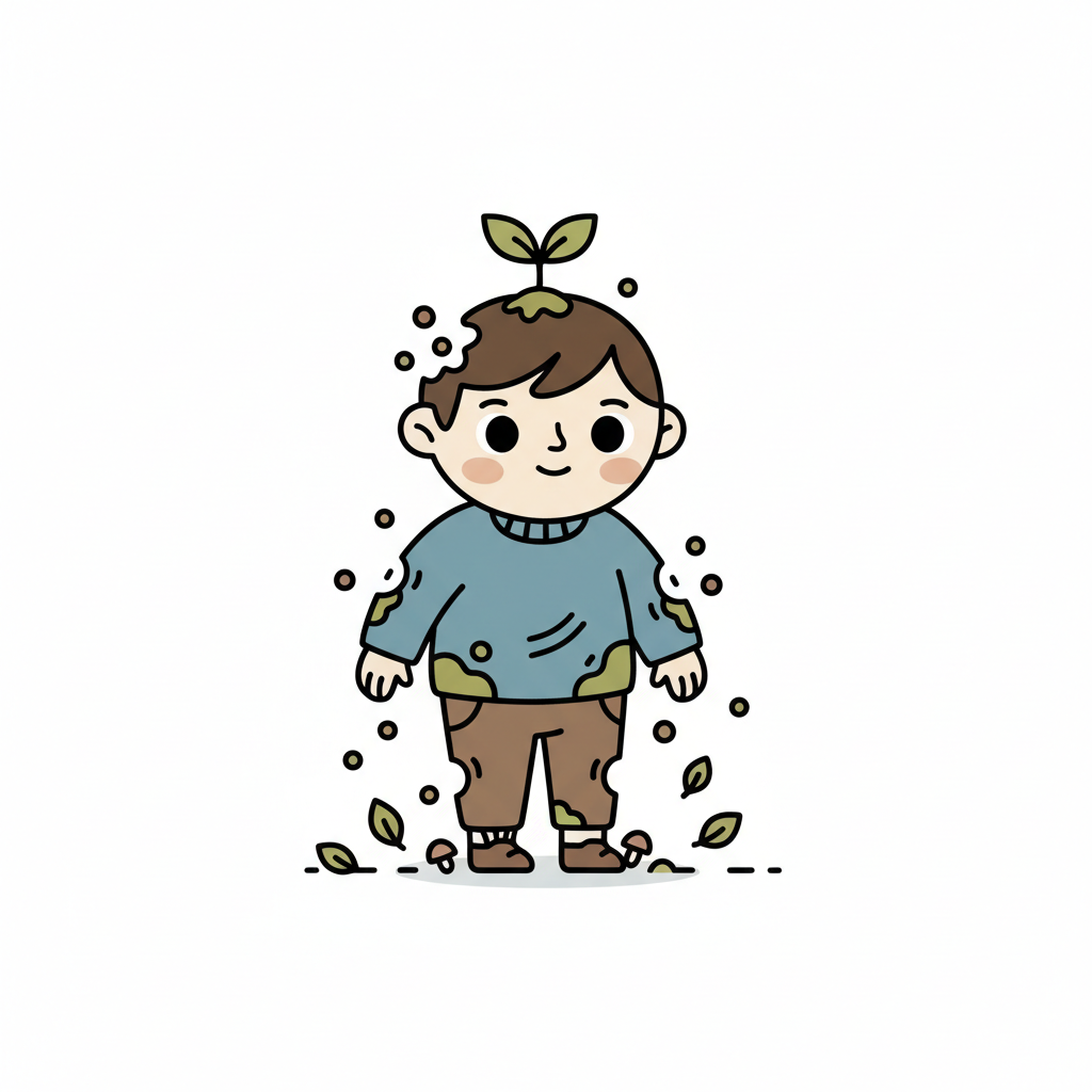 Niedlicher Cartoon-Junge mit Pflanze auf dem Kopf und Schmutzflecken, umgeben von Blättern.