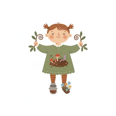 Niedliches Mädchen in grünem Kleid mit Gartenmotiv, hält Äste, ein Fuß mit Blumen, der andere mit Steinen.