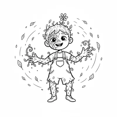 Ein lächelndes Kind, dessen Körper von Ranken und Blättern überwuchert wird, mit einer Blume auf dem Kopf.