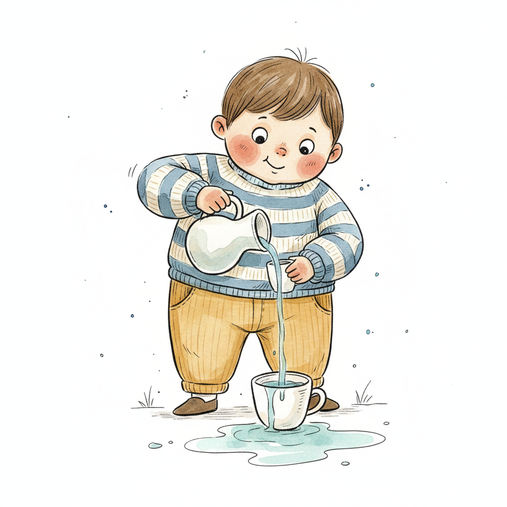 Ein kleiner Junge gießt Wasser aus einem Krug in eine Tasse, wobei etwas daneben geht.