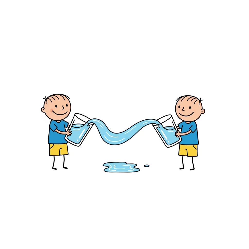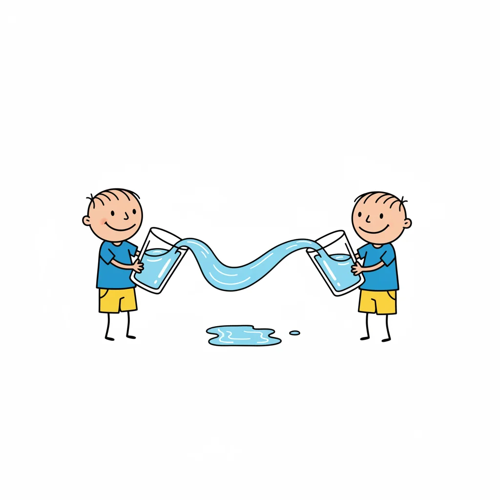 Zwei Jungen gießen Wasser von einem Glas ins andere, dabei verschütten sie etwas.