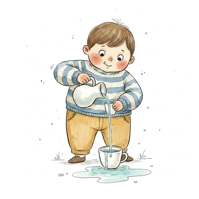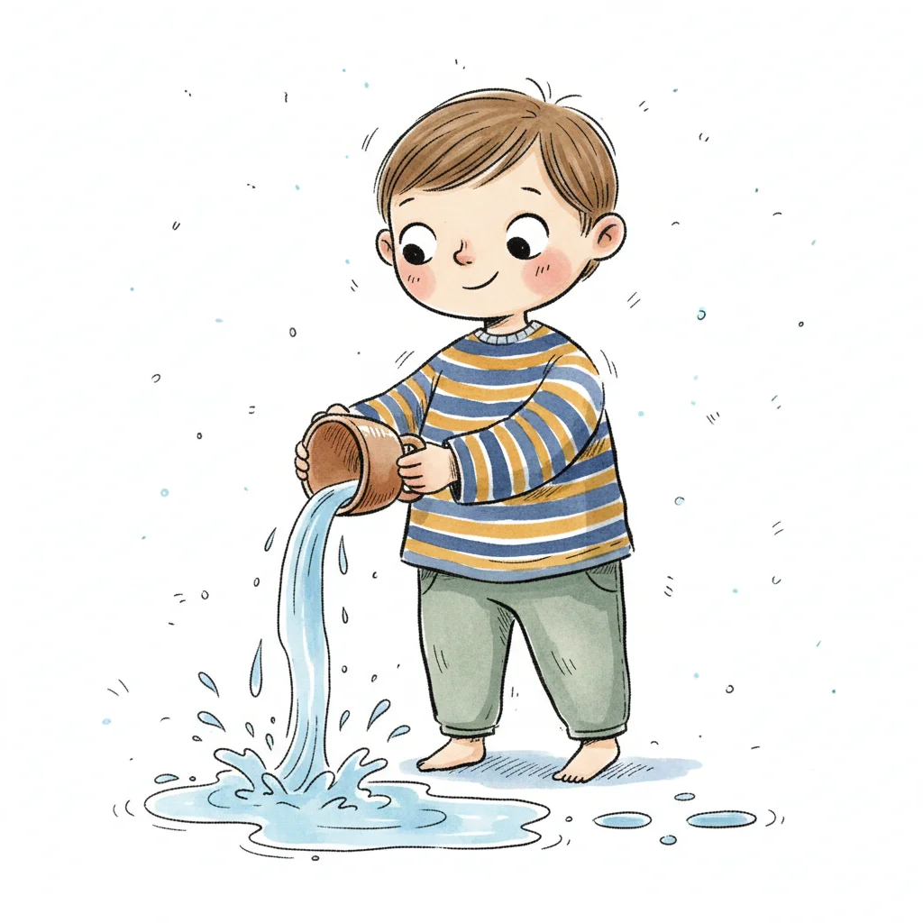 Fröhlicher Cartoon-Junge gießt Wasser aus einem Krug, das auf dem Boden spritzt.