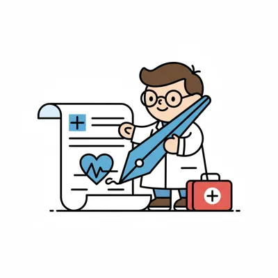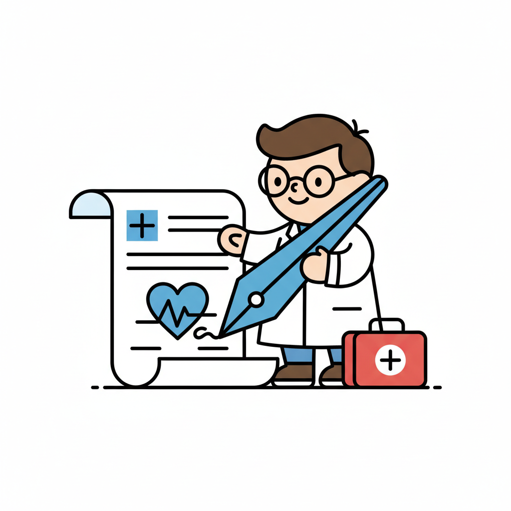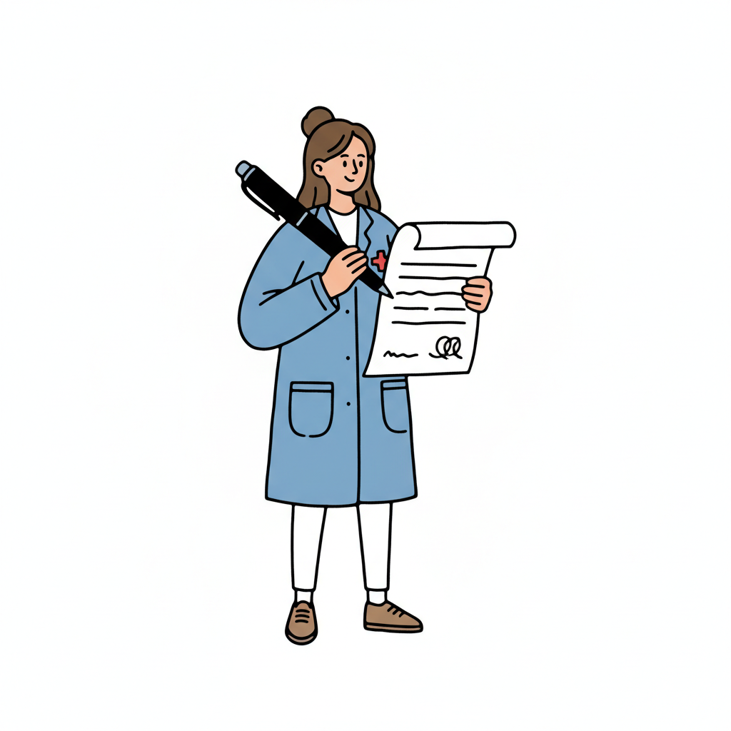 Cartoon einer lächelnden Ärztin im Kittel, die ein Dokument mit einem Stift bearbeitet.