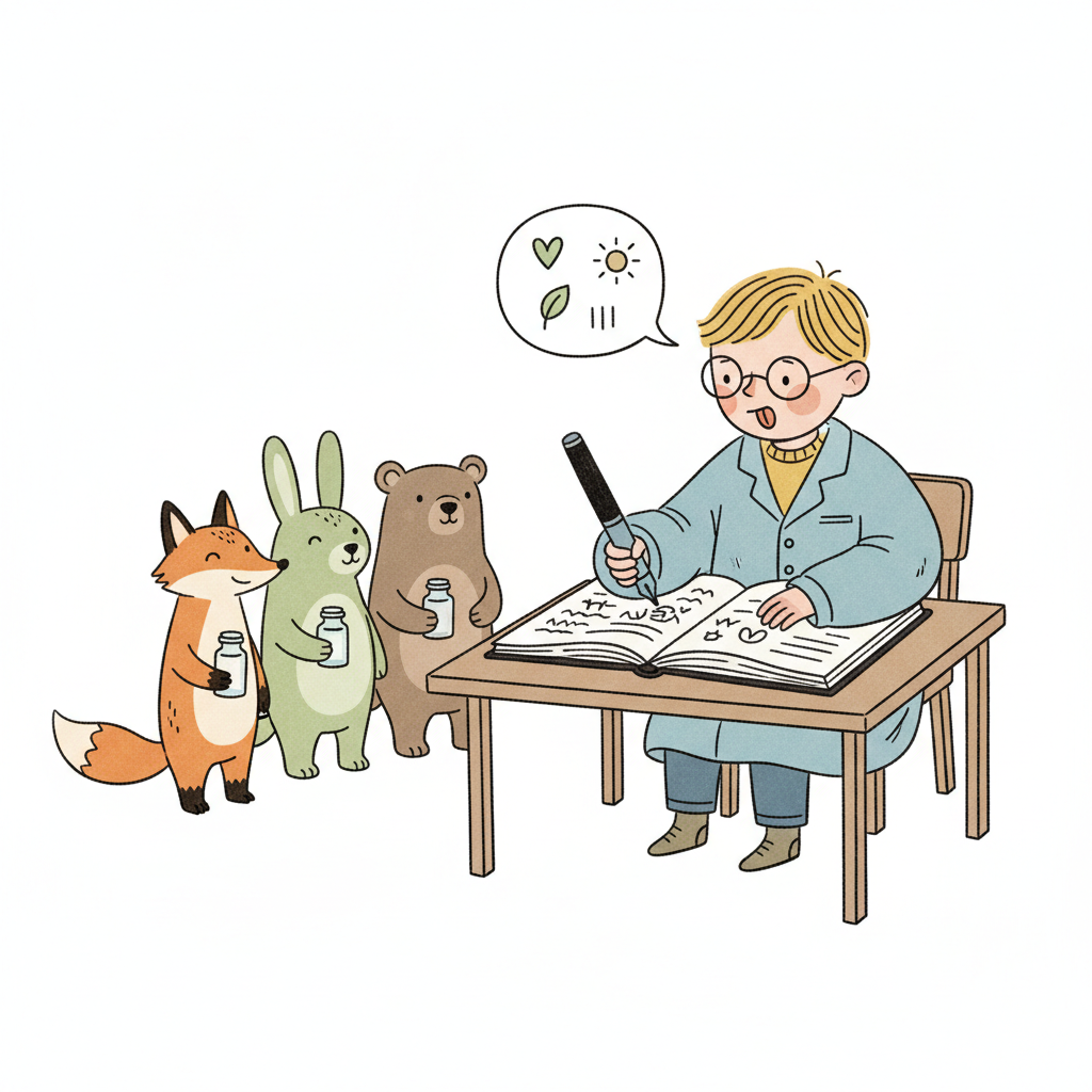 Junge im Laborkittel schreibt, während Fuchs, Hase und Bär mit Flaschen anstehen.