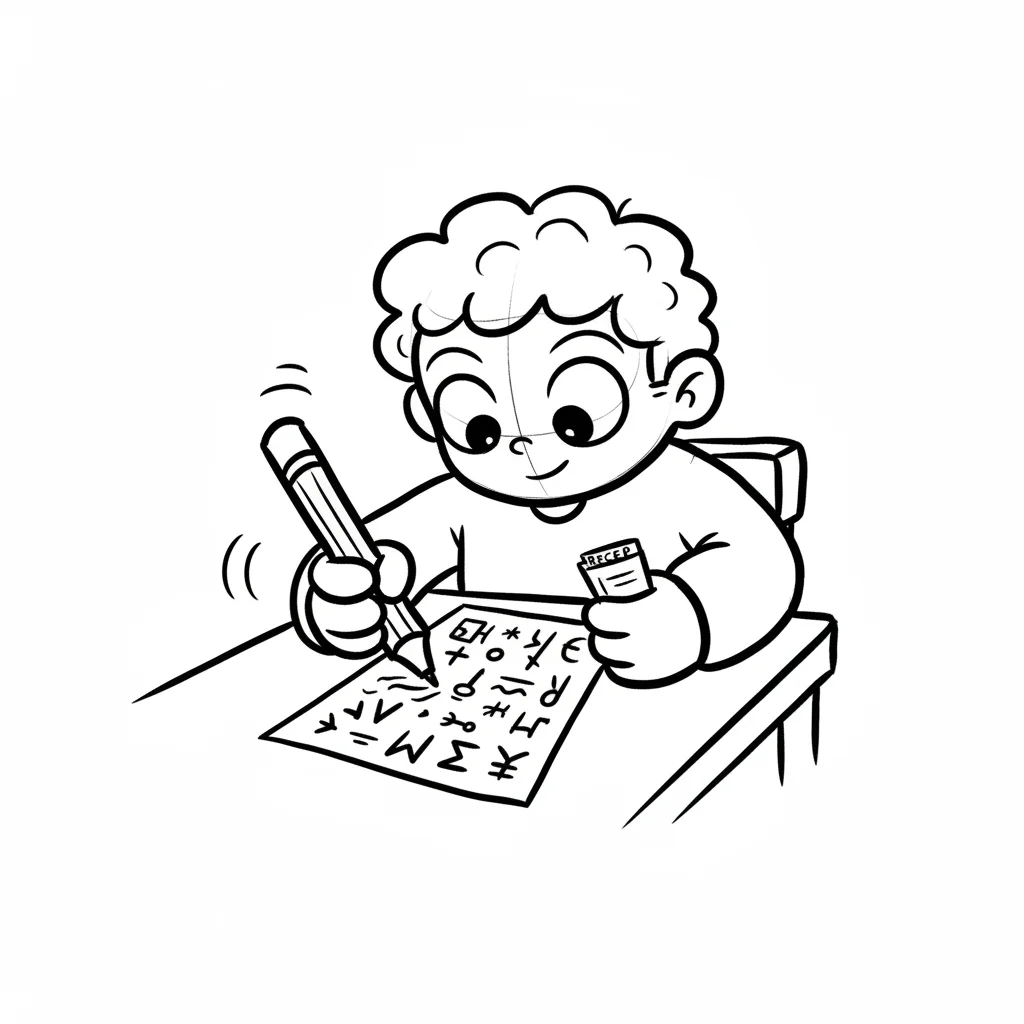 Schwarz-Weiß-Zeichnung eines Jungen, der mit Bleistift auf einem Blatt voller Symbole schreibt und einen Radiergummi hält.