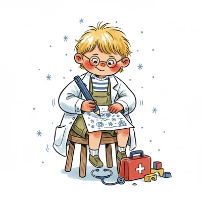 Ein kleiner Junge im Arztkittel zeichnet, umgeben von Spielzeug-Doktorutensilien.