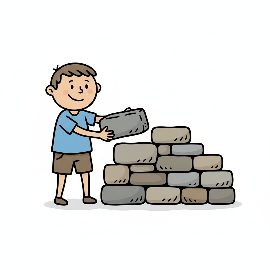 Ein lächelnder Junge baut eine Mauer aus grauen Steinen.