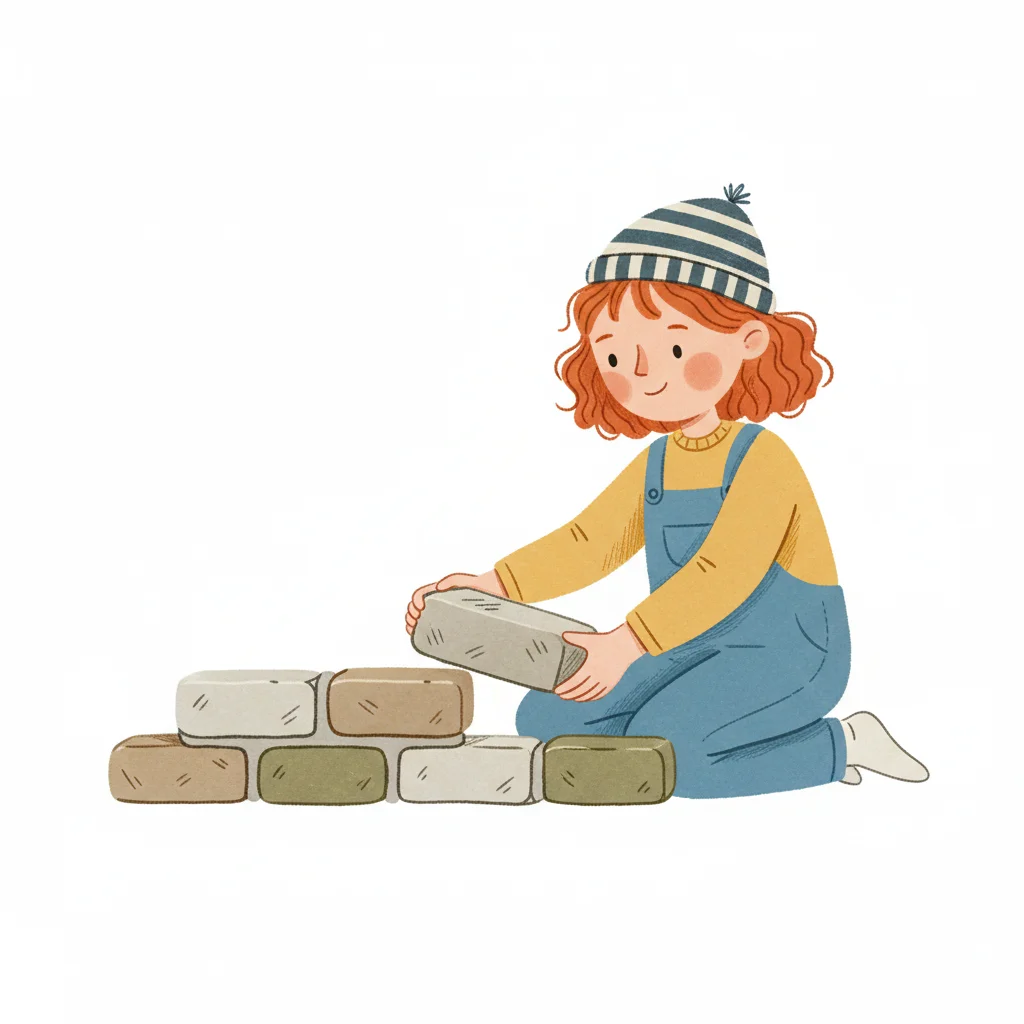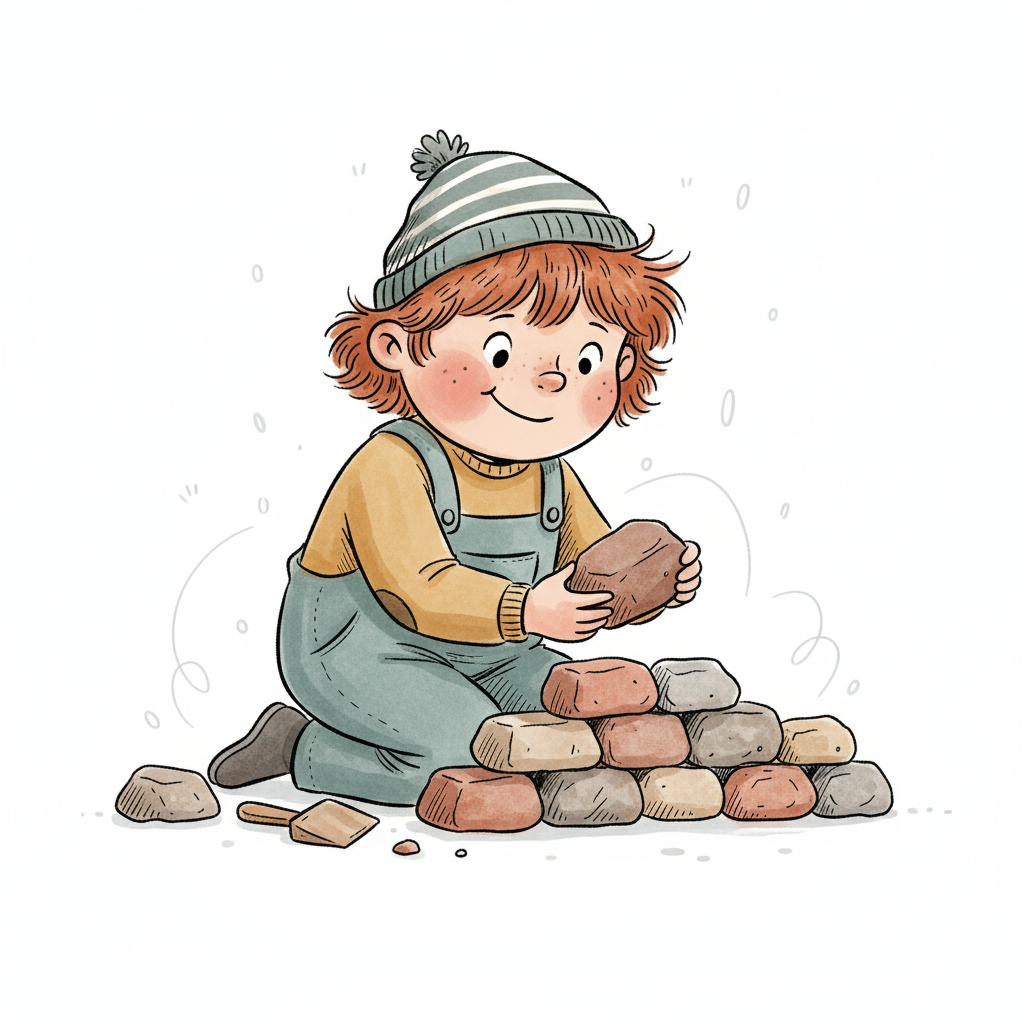 Ein fröhliches Kind in Mütze und Latzhose baut eine kleine Mauer aus bunten Steinen.