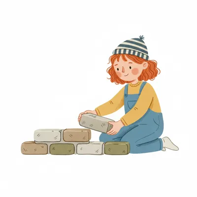 Ein lächelndes Mädchen mit rotem Haar und Mütze kniet und baut eine Mauer aus bunten Bausteinen.