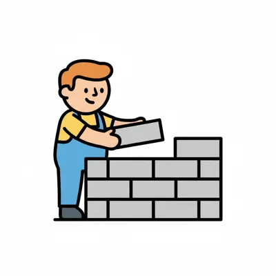 Zeichentrickfigur als Bauarbeiter, der eine Mauer aus Ziegeln baut.