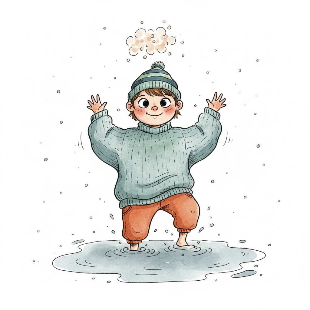 Fröhliches Kind in Mütze und Pullover planscht barfuß in einer Pfütze, umgeben von Spritzern.