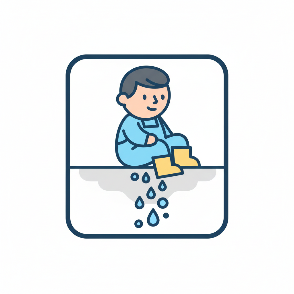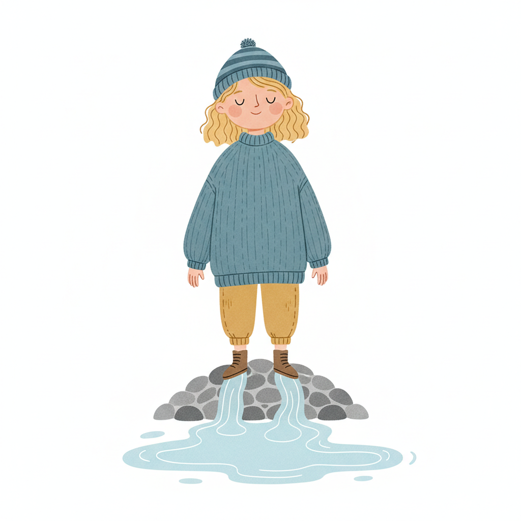 Niedliche Cartoon-Figur in Strickmütze und Pullover, die auf Felsen steht, während Wasser aus ihren Stiefeln fließt.