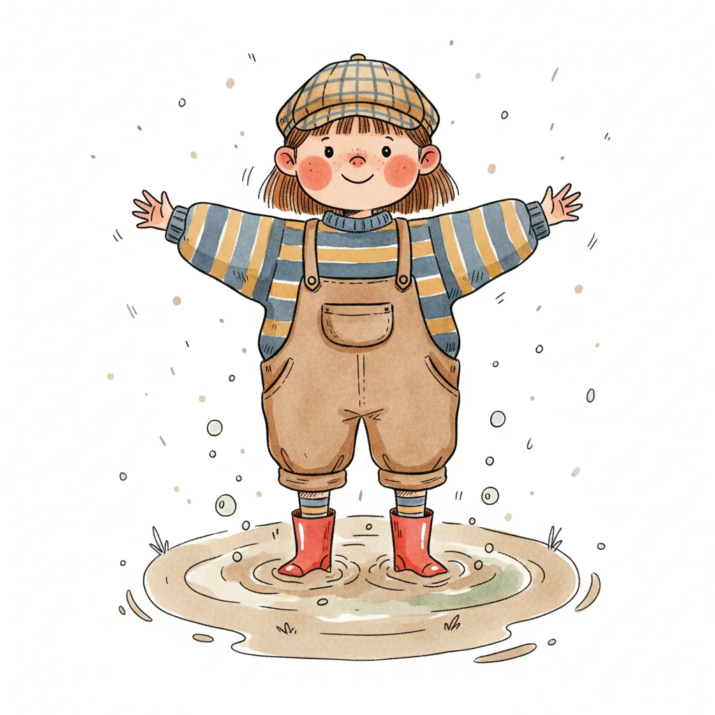 Glückliches Kind in Latzhose und Gummistiefeln planscht fröhlich in einer Matschpfütze.