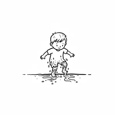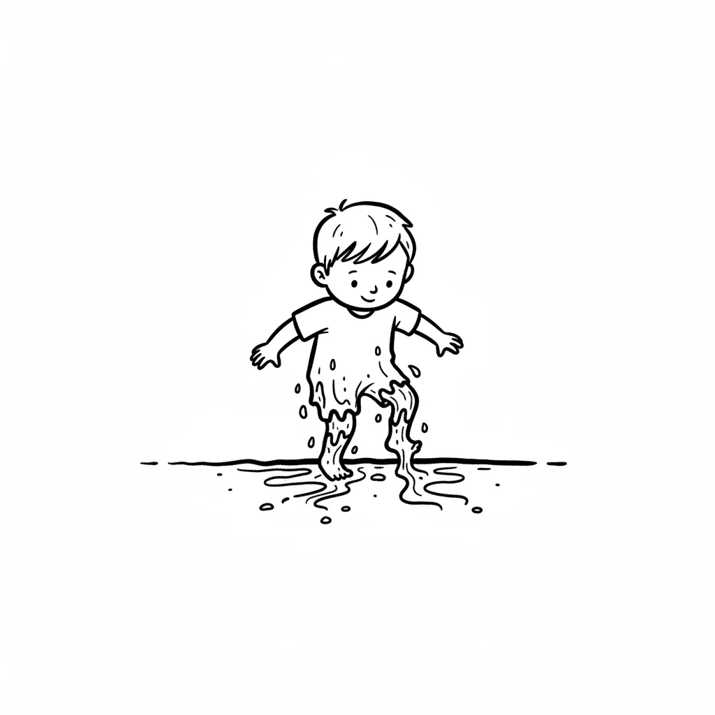 Ein glücklicher Junge planscht in einer Pfütze, seine Kleidung ist nass und schmutzig.